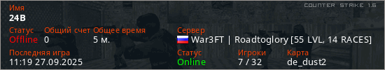 Играет на Counter Strike 1.6 сервере. Страна: РоссияПервый раз замечен 11:15 27.09.2025