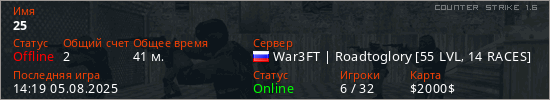 Последний раз был в сети 14:19 05.08.2025 Игрок с таким ником замечен на 29 серверах