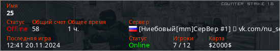Играет на Counter Strike 1.6 сервере. Страна: РоссияПервый раз замечен 17:43 27.11.2021