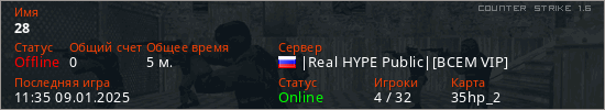 Играет на Counter Strike 1.6 сервере. Страна: РоссияПервый раз замечен 09:45 09.01.2025