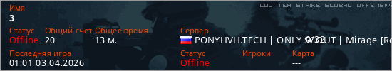 Играет на Counter Strike Global Offensive сервере. Страна: РоссияПервый раз замечен 16:37 01.04.2026