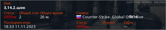 Играет на Counter Strike Source сервере. Страна: РоссияПервый раз замечен 16:45 04.11.2025