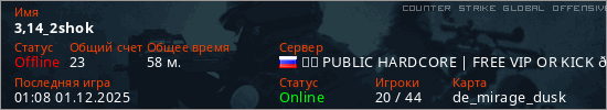 Играет на Counter Strike Global Offensive сервере. Страна: РоссияПервый раз замечен 11:13 10.10.2025