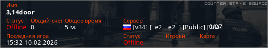 Играет на Counter Strike Source сервере. Страна: РоссияПервый раз замечен 15:09 10.02.2026