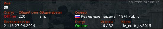 Играет на Counter Strike 1.6 сервере. Страна: РоссияПервый раз замечен 18:10 28.02.2023