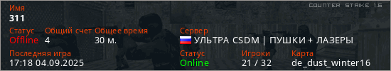Последний раз был в сети 17:18 04.09.2025 Игрок с таким ником замечен на 17 серверах