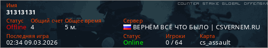 Играет на Counter Strike Global Offensive сервере. Страна: РоссияПервый раз замечен 02:31 09.03.2026