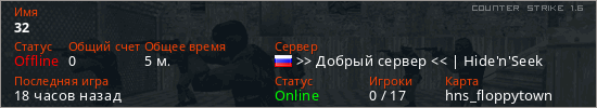 Последний раз был в сети 17 часов назад Игрок с таким ником замечен на 33 серверах