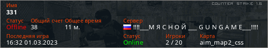 Играет на Counter Strike 1.6 сервере. Страна: РоссияПервый раз замечен 16:24 01.03.2023