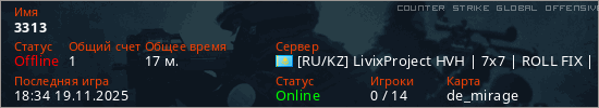 Играет на Counter Strike Global Offensive сервере. Страна: КазахстанПервый раз замечен 14:26 03.08.2025