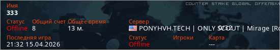 Играет на Counter Strike Global Offensive сервере. Страна: СШАПервый раз замечен 17:10 11.04.2026