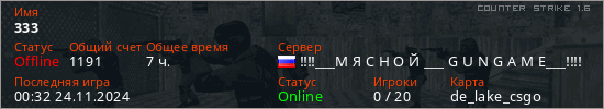 Играет на Counter Strike 1.6 сервере. Страна: РоссияПервый раз замечен 16:25 03.12.2022
