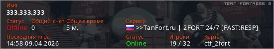 Играет на Team Fortress 2 сервере. Страна: РоссияПервый раз замечен 14:47 09.04.2026