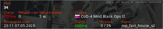 Играет на Call of Duty 4: Modern Warfare сервере. Страна: РоссияПервый раз замечен 23:09 07.05.2025