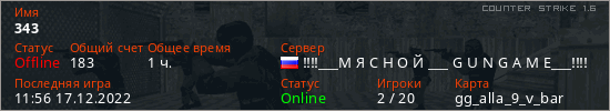 Последний раз был в сети 11:56 17.12.2022 Игрок с таким ником замечен на 17 серверах