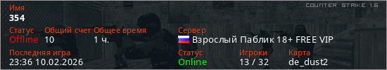 Играет на Counter Strike 1.6 сервере. Страна: РоссияПервый раз замечен 22:15 10.02.2026