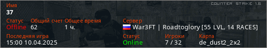 Играет на Counter Strike 1.6 сервере. Страна: РоссияПервый раз замечен 10:04 09.05.2022