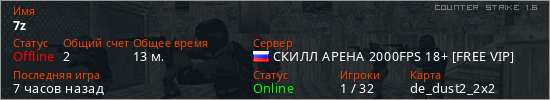 Играет на Counter Strike 1.6 сервере. Страна: РоссияПервый раз замечен 13:30 28.01.2026