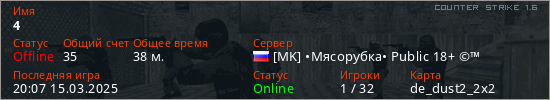 Последний раз был в сети 20:07 15.03.2025 Игрок с таким ником замечен на 48 серверах