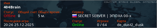 Играет на Counter Strike Global Offensive сервере. Страна: РоссияПервый раз замечен 19:52 25.12.2025
