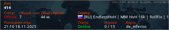 Играет на Counter Strike Global Offensive сервере. Страна: РоссияПервый раз замечен 09:36 15.11.2025