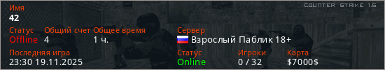 Играет на Counter Strike 1.6 сервере. Страна: РоссияПервый раз замечен 23:26 15.11.2023