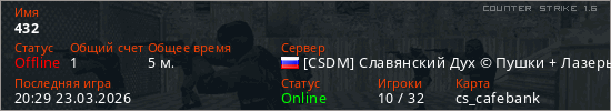 Играет на Counter Strike 1.6 сервере. Страна: РоссияПервый раз замечен 20:27 23.03.2026