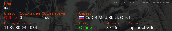 Играет на Call of Duty 4: Modern Warfare сервере. Страна: РоссияПервый раз замечен 11:26 30.04.2024