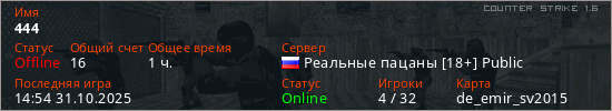 Играет на Counter Strike 1.6 сервере. Страна: РоссияПервый раз замечен 17:05 10.02.2023