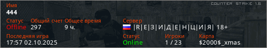 Играет на Counter Strike 1.6 сервере. Страна: РоссияПервый раз замечен 13:19 01.07.2019