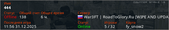 Играет на Counter Strike 1.6 сервере. Страна: РоссияПервый раз замечен 12:13 17.07.2021
