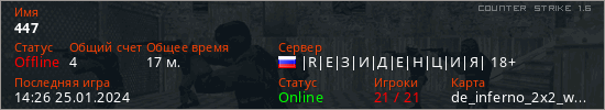 Играет на Counter Strike 1.6 сервере. Страна: РоссияПервый раз замечен 17:29 15.01.2024