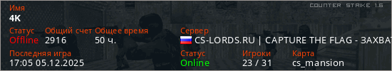 Последний раз был в сети 17:05 05.12.2025 Игрок с таким ником замечен на 23 серверах