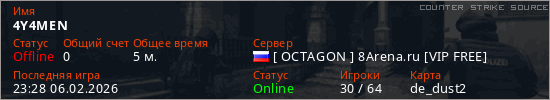 Играет на Counter Strike Source сервере. Страна: РоссияПервый раз замечен 23:05 06.02.2026