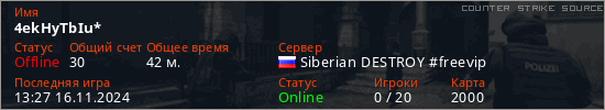 Играет на Counter Strike Source сервере. Страна: РоссияПервый раз замечен 19:45 03.02.2023
