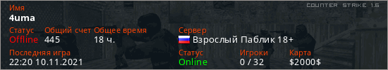Играет на Counter Strike 1.6 сервере. Страна: РоссияПервый раз замечен 01:40 23.11.2019