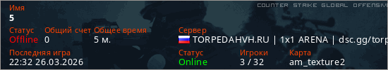 Играет на Counter Strike Global Offensive сервере. Страна: РоссияПервый раз замечен 22:30 26.03.2026