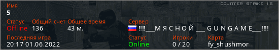 Последний раз был в сети 20:17 01.06.2022 Игрок с таким ником замечен на 51 сервере