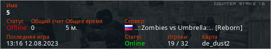 Играет на Counter Strike 1.6 сервере. Страна: РоссияПервый раз замечен 13:12 12.08.2023