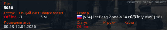 Играет на Counter Strike Source сервере. Страна: РоссияПервый раз замечен 00:47 12.04.2026