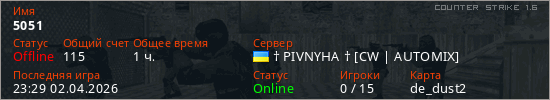 Играет на Counter Strike 1.6 сервере. Страна: УкраинаПервый раз замечен 22:22 23.03.2026