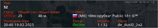 Последний раз был в сети 20:40 19.02.2025 Игрок с таким ником замечен на 51 сервере