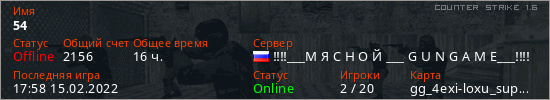 Играет на Counter Strike 1.6 сервере. Страна: РоссияПервый раз замечен 13:02 08.02.2022