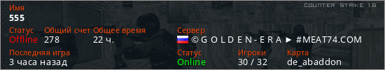 Играет на Counter Strike 1.6 сервере. Страна: РоссияПервый раз замечен 20:39 16.02.2023