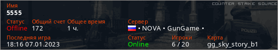 Играет на Counter Strike Source сервере. Страна: РоссияПервый раз замечен 11:54 03.12.2022