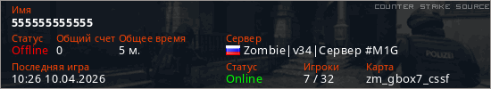 Играет на Counter Strike Source сервере. Страна: РоссияПервый раз замечен 10:21 10.04.2026