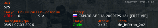 Играет на Counter Strike 1.6 сервере. Страна: РоссияПервый раз замечен 08:22 07.03.2026