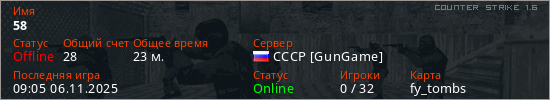 Играет на Counter Strike 1.6 сервере. Страна: РоссияПервый раз замечен 08:16 04.11.2025