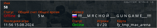Играет на Counter Strike 1.6 сервере. Страна: РоссияПервый раз замечен 11:54 15.08.2024