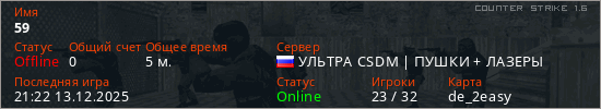 Играет на Counter Strike 1.6 сервере. Страна: РоссияПервый раз замечен 21:18 13.12.2025